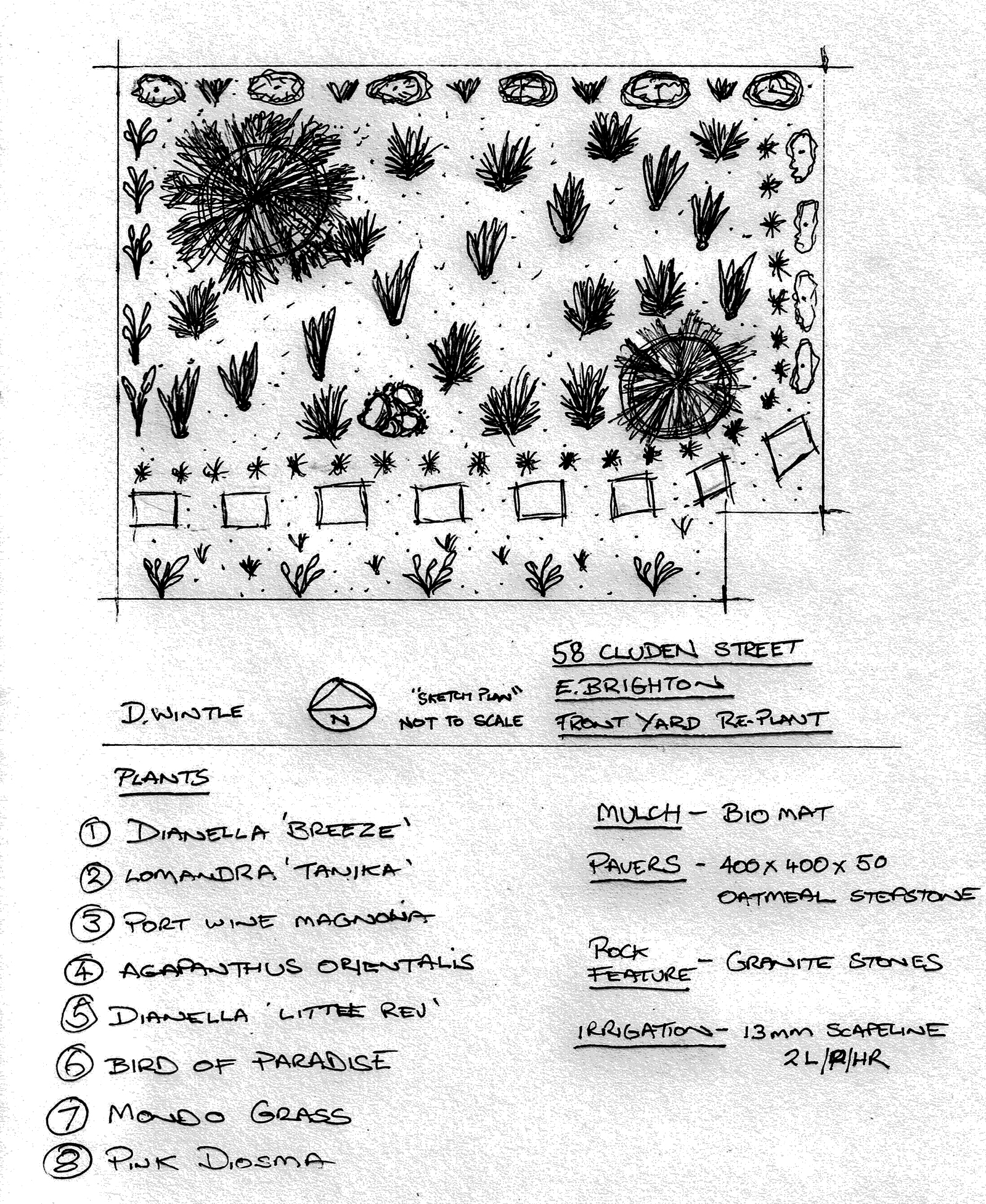 We did that and more. After an inital on site consulation we decided that a low mainteneace drought tolerant plant schedule was required. The inital design was really the final design (hence the schetch) as it ticked all the boxes for the landlord. Apart from minimal weeding this garden needed nearly no maintenace at all which is great for rental properties.